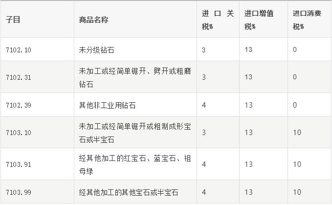 根據(jù)2019年4月1日起實(shí)施的增值稅降稅政策及《進(jìn)出口稅則對(duì)照使用手冊(cè)(2019版)》,寶石進(jìn)口時(shí)應(yīng)繳納關(guān)稅、增值稅和消費(fèi)稅,稅率分別為:
