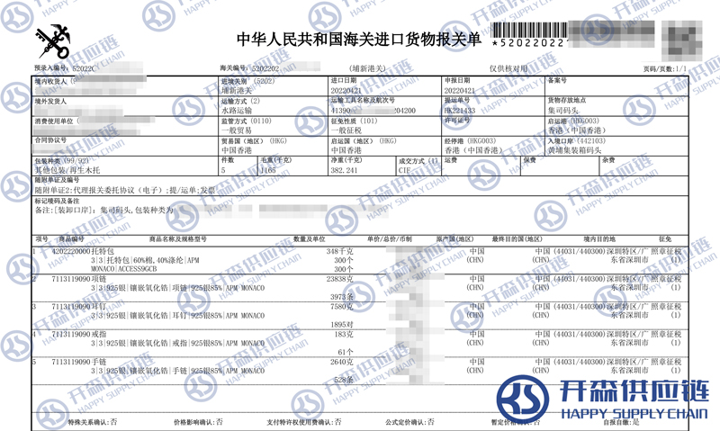 開(kāi)森進(jìn)口供應(yīng)鏈擁有豐富的珠寶首飾進(jìn)口報(bào)關(guān)操作經(jīng)驗(yàn)及案例,十余年操作經(jīng)驗(yàn)及案例可供參考,可按需定制珠寶首飾進(jìn)口方案,幫助客戶解決進(jìn)口難題,快速進(jìn)口清關(guān)到港到貨。