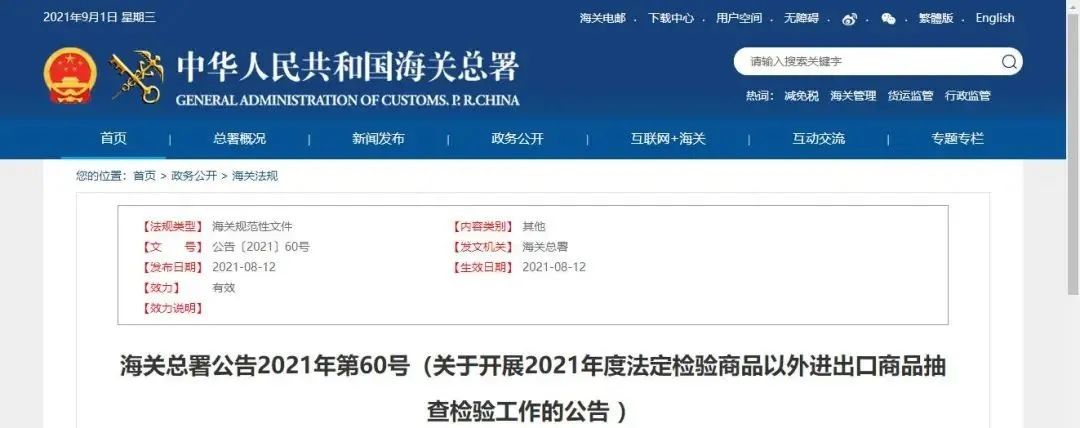 8月12日,海關(guān)總署發(fā)布2021年第60號公告,決定對2021年法定檢驗商品以外的部分進(jìn)出口商品實施抽查檢驗,抽查檢驗的商品范圍涉及20類進(jìn)出口商品,其中進(jìn)口商品13類,出口商品7類。