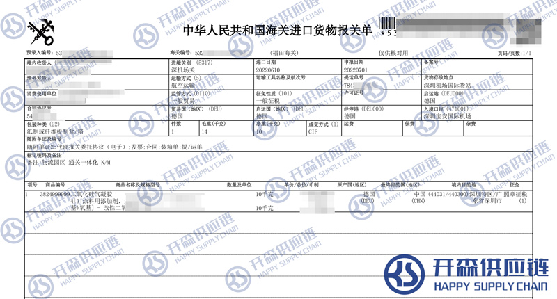 【本文結(jié)語】 上述就是德國二氧化硅氣凝膠進口報關清關代理服務【經(jīng)典案例】的全部內(nèi)容,希望能對您有所幫助,如有化工品進口報關上任何疑問及問題可隨時在線聯(lián)系我們或撥打 18002611553,開森供應鏈擁有豐富的化工品進口報關操作經(jīng)驗及案例,10余年進口經(jīng)驗為您所用,各類進口疑難都能為您一一解答及協(xié)助快速處理解決!