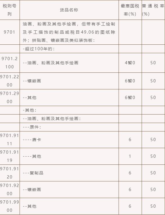 根據《中華人民共和國進出口稅則(2022版)》,繪畫作品的稅則號列和部分稅率如下(協(xié)定稅率及特惠稅率等詳見2022年稅則):
