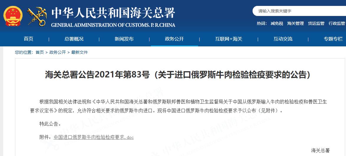 2021年10月18日,海關(guān)總署發(fā)布2021年第83號公告:允許符合相關(guān)要求的俄羅斯牛肉進口,詳情如下: