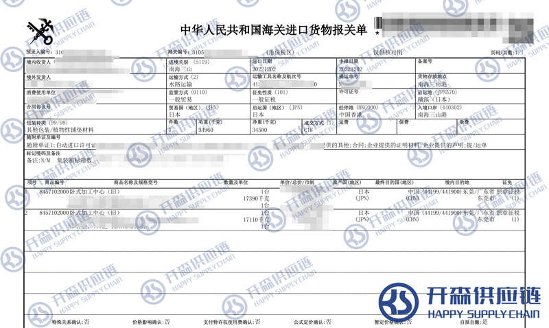 【本文結語】 上述就是寧波港舊臥式舊加工中心機床進口報關代理服務【經典案例】的全部內容,希望能對您有所幫助,如有舊加工中心進口報關上任何疑問及問題可隨時在線聯系我們或撥打 18002611553,開森供應鏈擁有豐富的舊加工中心進口報關操作經驗及案例,10余年進口經驗為您所用,各類進口疑難都能為您一一解答及協(xié)助快速處理解決!
