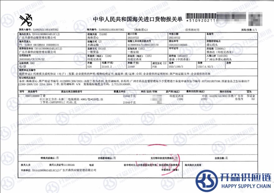 【本文結語】 上述就是【進口案例】印度丁香(丁子香)進口報關代理服務的全部內容,希望能對您有所幫助,如有農副產品進口報關上任何疑問及問題可隨時在線聯系我們或撥打 18002611553,開森供應鏈擁有豐富的農副產品進口報關操作經驗及案例,10余年進口經驗為您所用,各類進口疑難都能為您一一解答及協(xié)助快速處理解決!