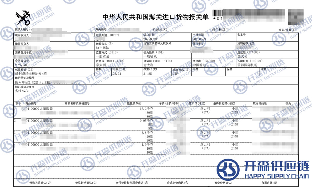 上述就是北京機(jī)場太陽眼鏡進(jìn)口報關(guān)代理服務(wù)【清關(guān)案例】的全部內(nèi)容,希望能對您有所幫助,如有進(jìn)口報關(guān),進(jìn)口報關(guān)代理公司,進(jìn)口報關(guān)代理上任何疑問及問題可隨時在線聯(lián)系我們或撥打 18002611553,開森供應(yīng)鏈擁有豐富的進(jìn)口報關(guān),進(jìn)口報關(guān)代理公司,進(jìn)口報關(guān)代理操作經(jīng)驗(yàn)及案例,10余年進(jìn)口經(jīng)驗(yàn)為您所用,各類進(jìn)口疑難都能為您一一解答及協(xié)助快速處理解決!