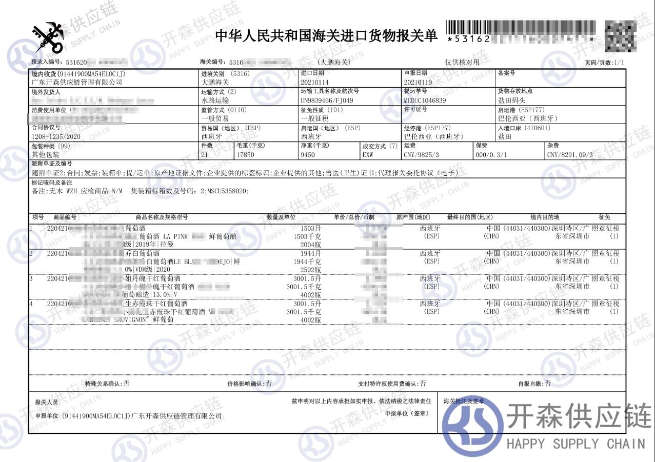 【本文結語】 上述就是【進口案例】西班牙葡萄酒進口報關代理服務的全部內容,希望能對您有所幫助,如有葡萄酒進口報關上任何疑問及問題可隨時在線聯(lián)系我們或撥打 18002611553,開森供應鏈擁有豐富的葡萄酒進口報關操作經驗及案例,10余年進口經驗為您所用,各類進口疑難都能為您一一解答及協(xié)助快速處理解決!