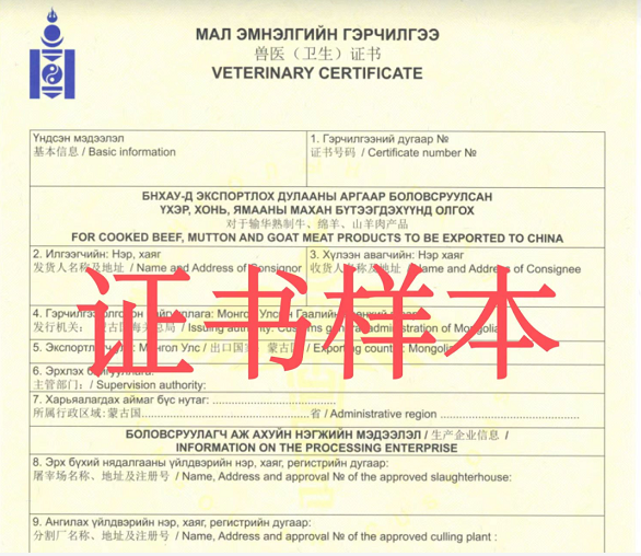 蒙古國(guó)官方已向中國(guó)海關(guān)總署備案確認(rèn)蒙古國(guó)熟制牛羊肉產(chǎn)品獸醫(yī)衛(wèi)生證書樣式、官方印章及官方獸醫(yī)簽字等相關(guān)信息。進(jìn)口蒙古國(guó)熟制牛羊肉產(chǎn)品應(yīng)附有蒙古國(guó)官方出具的獸醫(yī)衛(wèi)生證書,并加蓋官方印章和官方獸醫(yī)簽字,同時(shí)向中國(guó)海關(guān)推送對(duì)應(yīng)蒙古國(guó)輸華肉類衛(wèi)生證書電子信息。